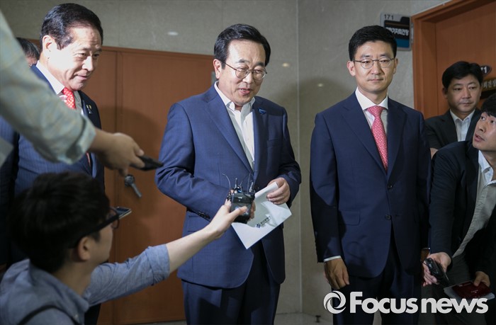 (서울=포커스뉴스) 서병수(가운데) 부산시장이 20일 오후 서울 여의도 국회 정론관에서 신공항 입지 결정을 앞두고 입장 발표 기자회견을 마친 뒤 김세연(오른쪽) 새누리당 부산시당 위원장, 배덕광 의원과 함께 취재진 질문에 답하고 있다.