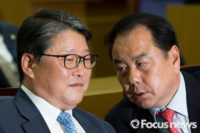 (서울=포커스뉴스) 조원진(왼쪽) 새누리당 의원과 이채익 새누리당 의원이 20일 오후 서울 여의도 국회의원회관에서 열린 친박계 초-재선 의원 모임에 참석해 대화를 나누고 있다.