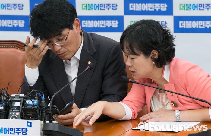 (서울=포커스뉴스) 박완주(왼쪽) 더불어민주당 원내수석부대표와 이정미 정의당 원내수석부대표가 20일 오후 서울 여의도 국회에서 현안 관련 야3당 원내수석부대표 회동에 앞서 대화하고 있다.