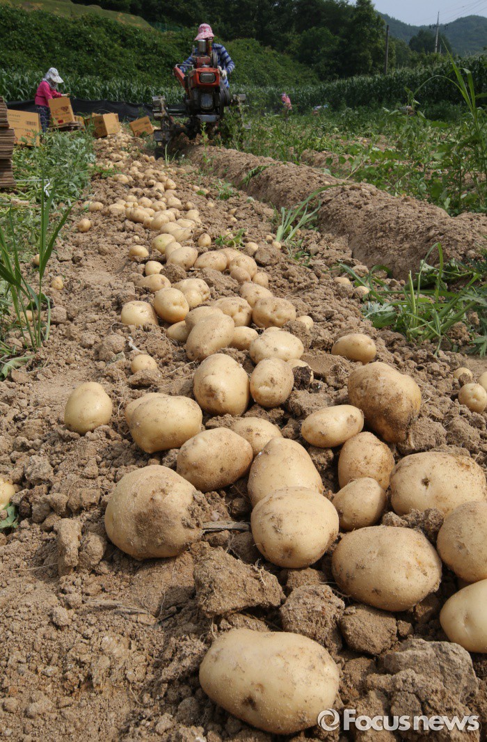 (괴산-포커스뉴스) 장마철을 앞두고 20일 오후 충북 괴산군 들녘에서 농민들이 감자를 수확하고 있다.