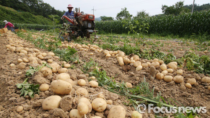 (괴산-포커스뉴스) 장마철을 앞두고 20일 오후 충북 괴산군 들녘에서 농민들이 감자를 수확하고 있다.