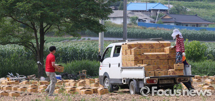 (괴산-포커스뉴스) 장마철을 앞두고 20일 오후 충북 괴산군 들녘에서 농민들이 감자를 수확하고 있다.