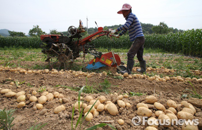 (괴산-포커스뉴스) 장마철을 앞두고 20일 오후 충북 괴산군 들녘에서 농민들이 감자를 수확하고 있다.