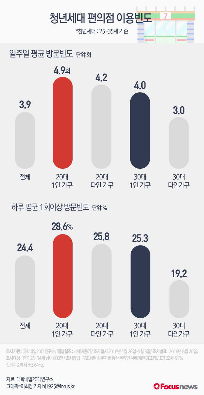 (서울=포커스뉴스) 20일 대학내일20대 연구소가 발표한 보고서에 따르면 2535 1인 가구의 편의점 방문 빈도는 다인 가구의 방문 빈도보다 높았다. 하루 평균 1회 이상 방문 비율 또한, 20대 1인 가구가 가장 높았으며, 30대 다인 가구가 가장 낮았다.