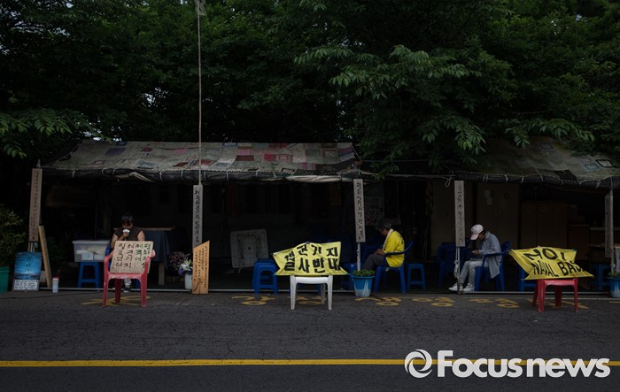(제주=포커스뉴스) 서귀포시가 제주해군기지 크루즈터미널 조성공사를 이유로 해군기지 건설 반대운동에 사용해 온 망루 등 시설물들을 자진 철거하라는 3차 계고장을 강정마을회에 보내 행정대집행이 예고되고 있다. 20일 오전 제주 서귀포시 강정마을에서 해군기지 건설을 반대하는 활동가들이 미사 준비를 하고 있다. 이날 행정대집행 문제로 회의를 한 강정마을회는 "이들 시설물은 기지 건설 반대 투쟁에 대한 상징적인 것으로 함부로 철거할 수 없다고 마을 주민의 의견을 모았다"며 시설물을 이전한 뒤 보존해달라'고 제주도에 건의했다.