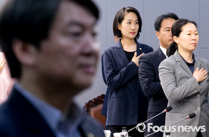 (서울=포커스뉴스) 21일 오전 서울 여의도 국회 의원회관에서 열린 국민의당 17차 정책역량강화 워크숍에 참석한 안철수(왼쪽부터) 상임공동대표, 김수민, 이용주, 권은희 의원이 국기에 대한 경례를 하고 있다.