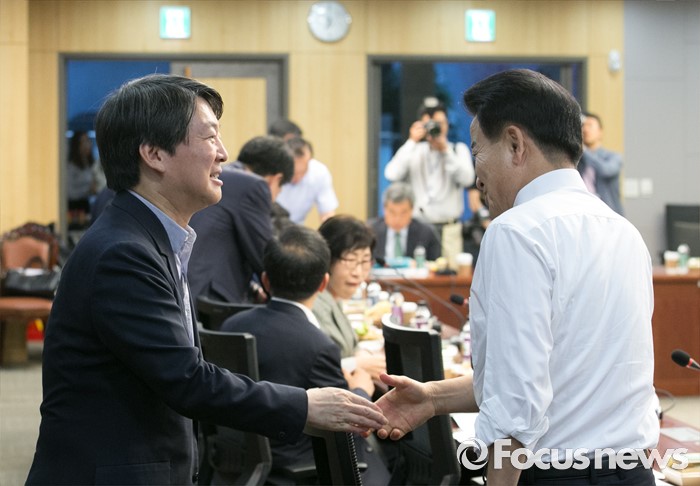 (서울=포커스뉴스) 21일 오전 서울 여의도 국회 의원회관에서 열린 국민의당 17차 정책역량강화 워크숍에 참석한 안철수(왼쪽) 상임공동대표와 정동영 의원이 인사하고 있다.