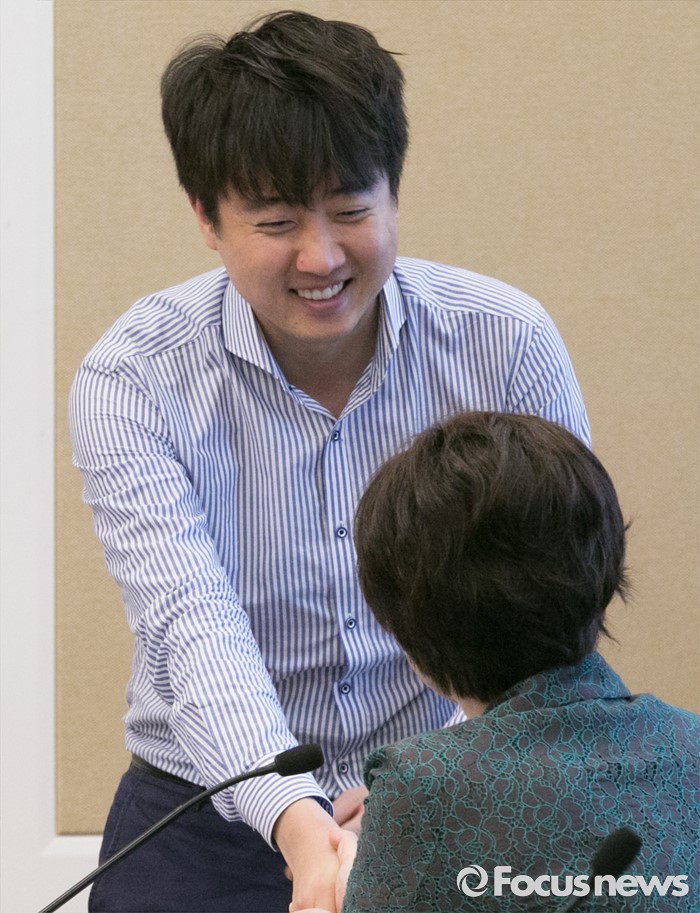 (서울=포커스뉴스) 21일 오전 서울 여의도 국회 귀빈식당에서 열린 새누리당 일자리특위 1차 회의에 참석한 이준석(왼쪽) 클라세스튜디오 대표가 최연혜 의원과 인사하고 있다.