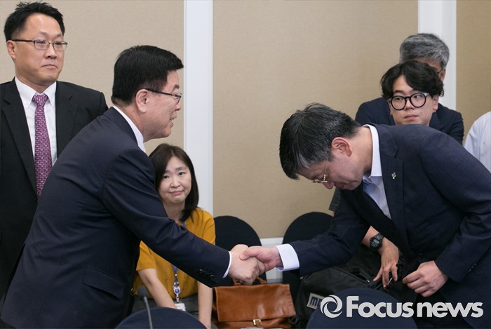 (서울=포커스뉴스) 21일 오전 서울 여의도 국회 귀빈식당에서 열린 새누리당 일자리특위 1차 회의에 참석한 김광림(왼쪽) 정책위의장과 최상목 기획재정부 1차관이 인사하고 있다.