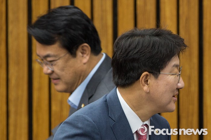 (서울=포커스뉴스) 정진석 새누리당 원내대표와 권성동 사무총장이 21일 오전 서울 여의도 국회에서 열린 원내대책회의에 참석하고 있다.