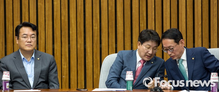 (서울=포커스뉴스) 권성동 새누리당 사무총장과 김도읍 원내수석부대표가 21일 오전 서울 여의도 국회에서 열린 원내대책회의에 참석해 대화 하고 있다.