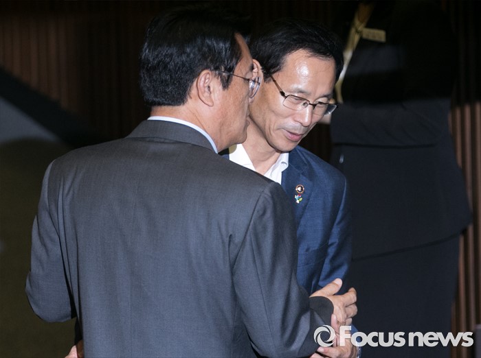 (서울=포커스뉴스) 21일 오전 서울 여의도 국회에서 열린 343회 국회(임시회) 4차 본회의에 참석한 정진석(왼쪽) 새누리당 원내대표와 최정호 국토교통부 2차관이 대화하고 있다.
