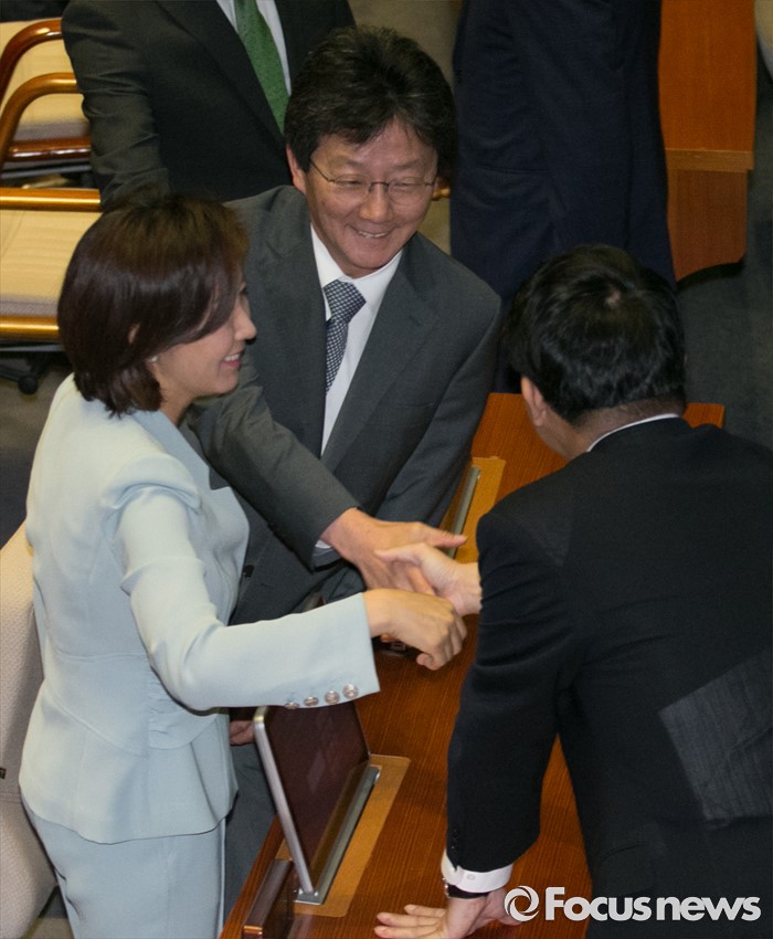 (서울=포커스뉴스) 21일 오전 서울 여의도 국회에서 열린 343회 국회(임시회) 4차 본회의에 참석한 나경원(왼쪽부터), 유승민, 윤상현 새누리당 의원이 인사하고 있다.