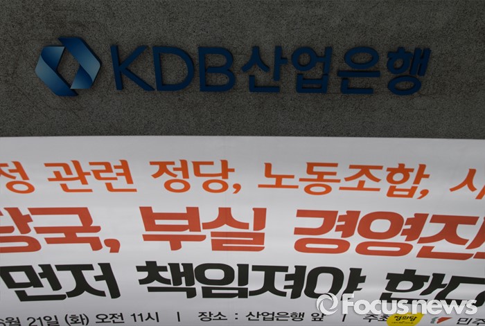 (서울=포커스뉴스) 21일 오전 서울 영등포구 산업은행 본점 앞에서 열린 조선해운업 구조조정 관련 정부와 금융당국, 산업은행 규탄 기자회견이 열리고 있다.