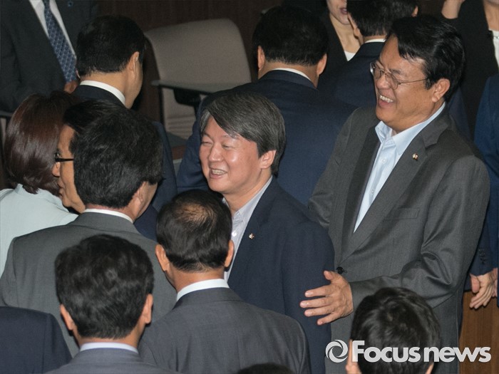 | △ 정진석, 안철수 어깨 잡고 함박웃음 |