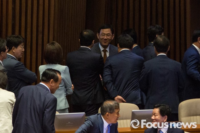 (서울=포커스뉴스) 주호영 무소속 의원이 21일 오전 서울 여의도 국회에서 열린 본회의에 참석해 국회사무총장 임명승인안 투표를 마친 뒤 동료 의원들과 인사 하고 있다.