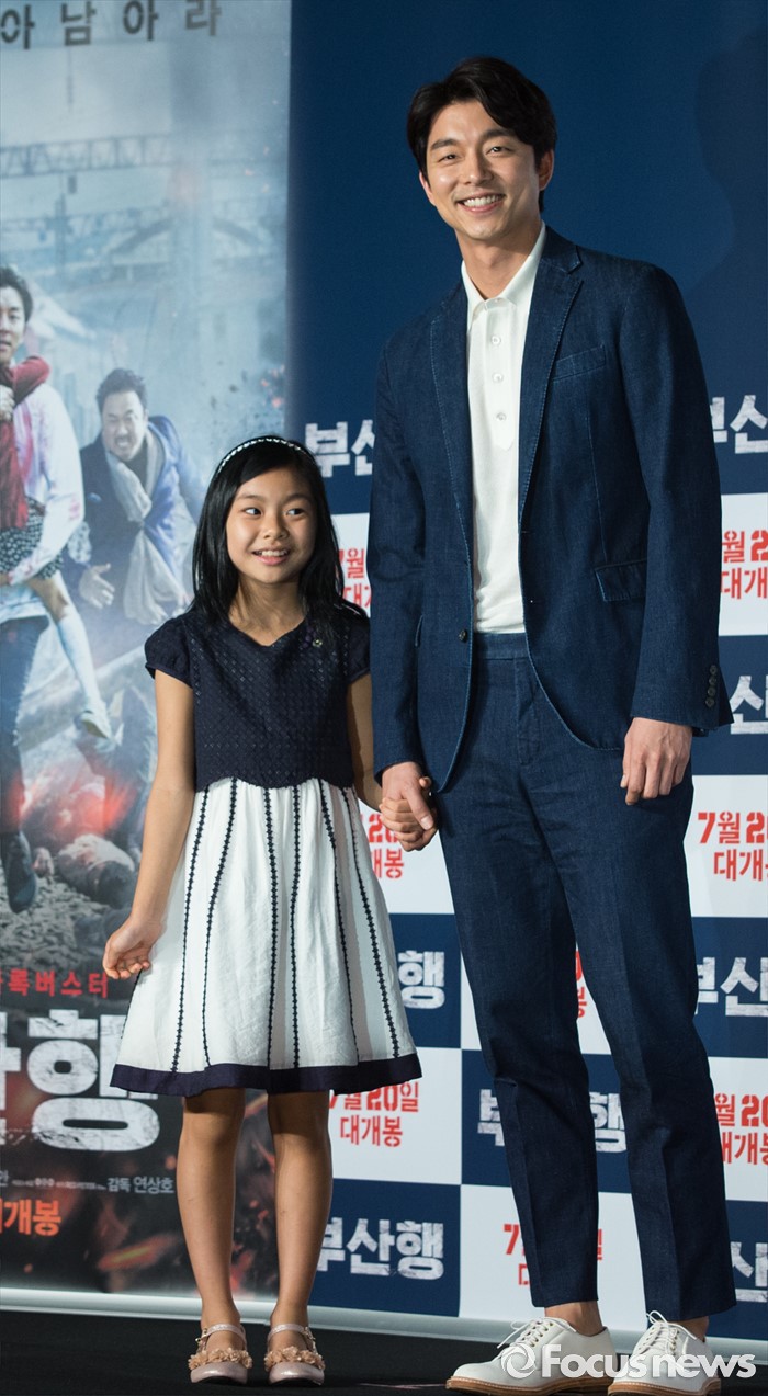 (서울=포커스뉴스) 21일 오전 서울 종로구 나인트리컨벤션에서 열린 영화 '부산행' 제작보고회에 참석한 배우 김수안(왼쪽)과 공유가 포토타임을 갖고 있다.