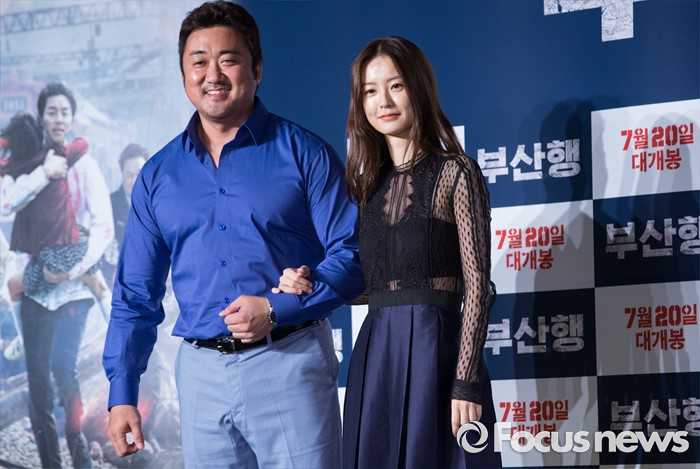 (서울=포커스뉴스) 21일 오전 서울 종로구 나인트리컨벤션에서 열린 영화 '부산행' 제작보고회에 참석한 배우 마동석(왼쪽)과 정유미가 포토타임을 갖고 있다.