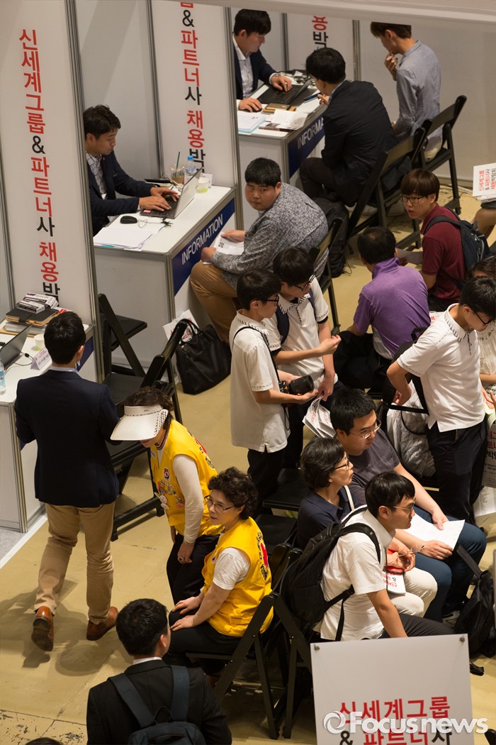 (서울=포커스뉴스) 21일 오후 서울 강남구 코엑스 D2홀에서 열린 신세계그룹&파트너사 채용박람회에서 구직자들이 희망 부스를 둘러보고 있다.