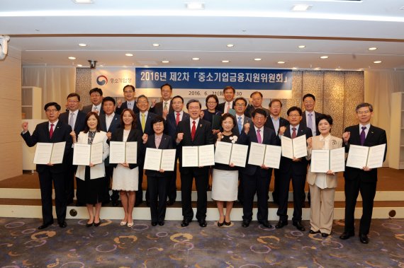 또한 구조조정 관련 건의사항으로 △구조조정을 겪은 기업의 재기를 지원하는 발판 마련 △일시적 자금난이 구조조정까지 이어지지 않도록 금융지원 확대 등을 요청했다.주영섭 중기청장(앞줄 왼쪽 5번째)이 '중소기업 금융지원위원회' 참석자들과 협력 선언문에 서명한 후 기념촬영을 하고 있다.<사진제공=중기청>