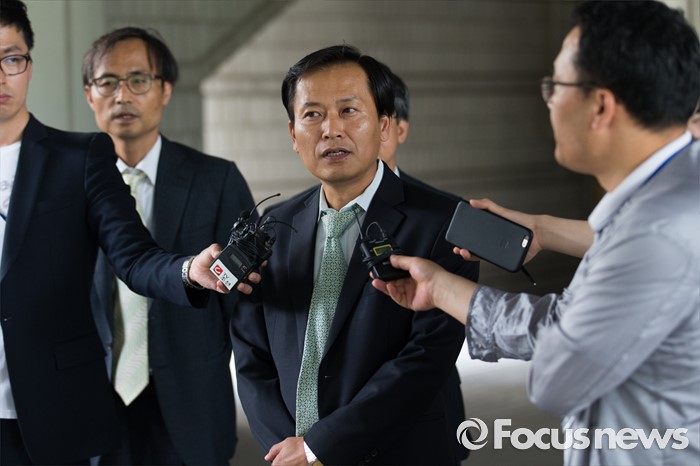 (서울=포커스뉴스) 채희준(오른쪽) 민주 사회를 위한 변호사모임 통일위원회 위원장이 21일 오후 서울 서초구 서울중앙지방법원에서 국가정보원 상대 북한 식당종업원 인신구제청구 1차 심문기일에 참석 전 취재진 질문에 답변하고 있다.