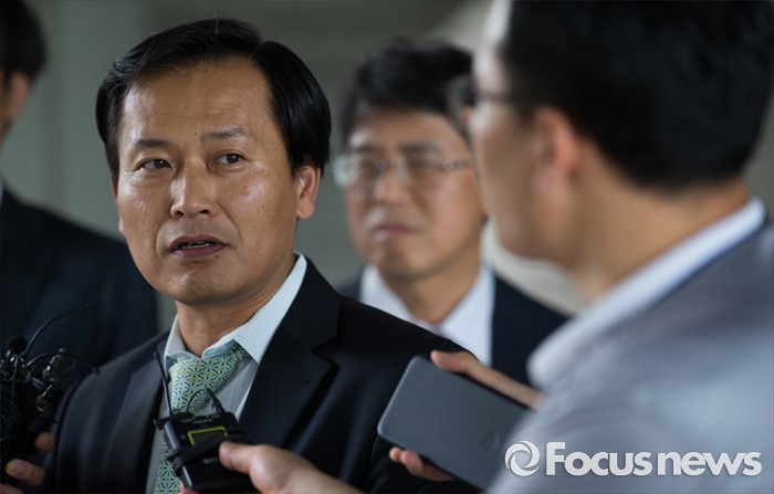 (서울=포커스뉴스) 채희준(오른쪽) 민주 사회를 위한 변호사모임 통일위원회 위원장이 21일 오후 서울 서초구 서울중앙지방법원에서 국가정보원 상대 북한 식당종업원 인신구제청구 1차 심문기일에 참석 전 취재진 질문에 답변하고 있다.