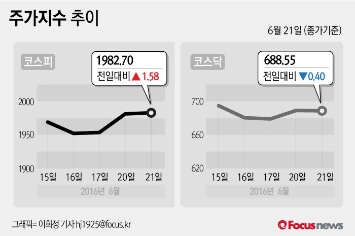 (서울=포커스뉴스) 21일 코스피지수는 전날 보다 0.08%(1.58포인트) 오른 1982.70에 장을 마쳤다. 코스닥지수는 전일 대비 0.06%(0.40포인트) 내린 688.55에 마감했다.