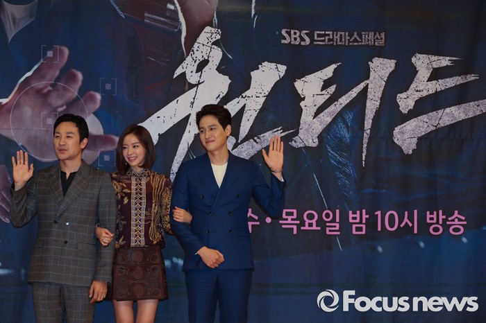 (서울=포커스뉴스) 21일 오후 서울 양천구 목동SBS에서 열린 SBS드라마스페셜 원티드 제작발표회에 참석한 배우 엄태웅,배우 김아중, 배우 백해준이 포토타임을 갖고 있다.