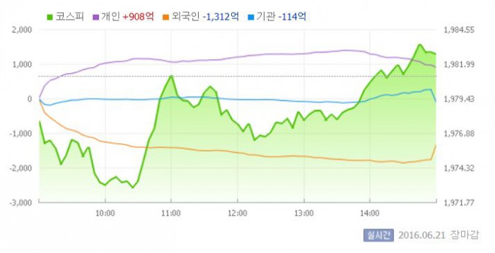 이날 코스피는 전일 대비 0.17% 하락한 1977.80으로 장을 시작했다. 이후 지수는 보합권에서 소폭의 하락세를 이어갔다. 그러나 장 마감을 1시간 남짓 남기고 지수는 강보합세로 전환했다.