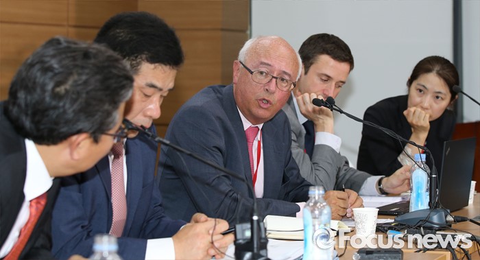 (세종=포커스뉴스) 장 마리 슈발리에(왼쪽 세 번째) 프랑스 파리공항공단자회사 ADPi 수석엔지니어가 21일 오후 세종시 정부세종청사 국토교통부 브리핑실에서 열린 동남권 신공항 타당성 검토 연구 최종 보고회에서 입지선정 결과 발표를 마치고 취재진의 질문에 답변하고 있다. 오른쪽부터 손명수 국토부 공항항행정책관, 서훈택 국토부 항공정책실장, 장 마리 슈발리에 프랑스 파리공항공단자회사 ADPi 수석엔지니어.