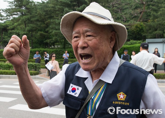 (서울=포커스뉴스) 21일 오후 서울 서초구 서울중앙지방법원 앞에서 보수단체 대한민국 구국채널 회원이 국가정보원 상대 북한 식당종업원 인신구제청구 소송 관련 민주사회를 위한 변호사모임을 규탄하고 있다.