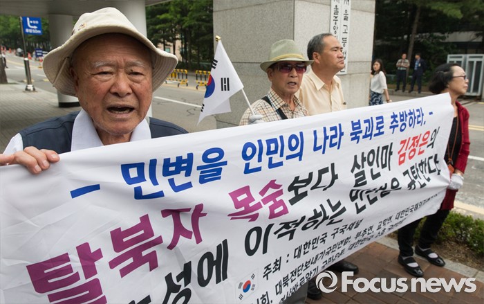 (서울=포커스뉴스) 21일 오후 서울 서초구 서울중앙지방법원 앞에서 보수단체 대한민국 구국채널 회원들이 국가정보원 상대 북한 식당종업원 인신구제청구 소송 관련 민주사회를 위한 변호사모임을 규탄하고 있다.