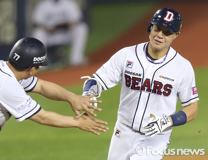 (서울=포커스뉴스) 12일 서울 잠실구장에서 열린 2016 프로야구 kt-두산 경기 4회말 2사 1루에서 두산 박세혁이 우월 2점 홈런을 치고 3루를 돌며 전형도 코치의 환영을 받고 있다.