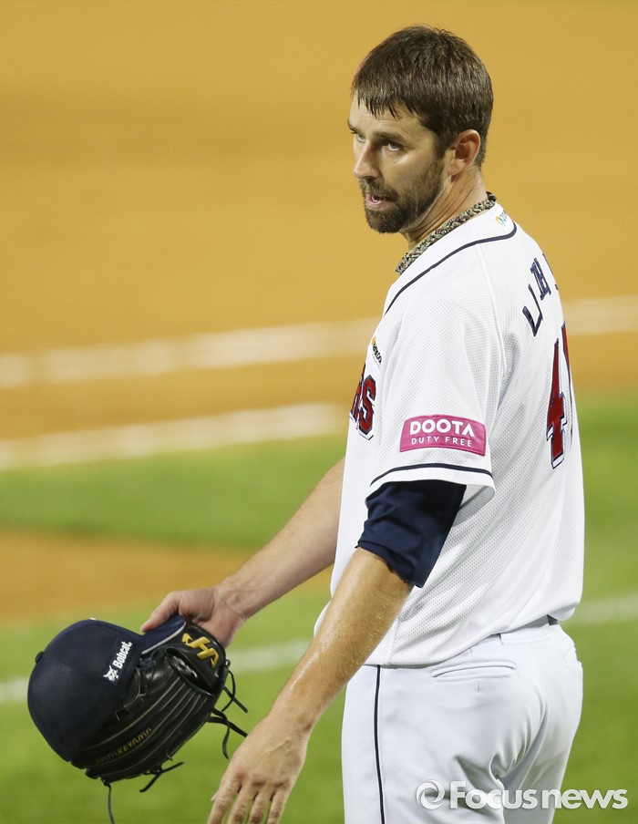 (서울=포커스뉴스) 12일 서울 잠실구장에서 열린 2016 프로야구 kt-두산 경기에서 두산 투수 니퍼트가 6회 수비를 마치고 공수교대하며 동료들을 맞이하고 있다.
