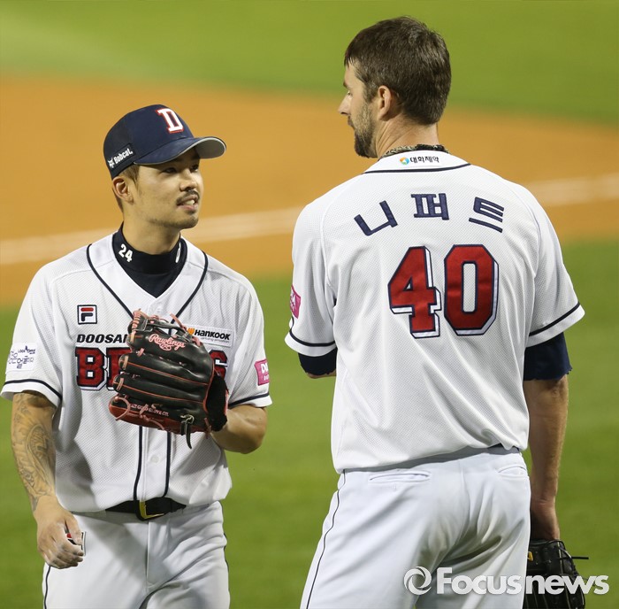 (서울=포커스뉴스) 12일 서울 잠실구장에서 열린 2016 프로야구 kt-두산 경기에서 두산 투수 니퍼트가 6회 수비를 마치고 공수교대하며 2루수 오재원을 맞이하고 있다.