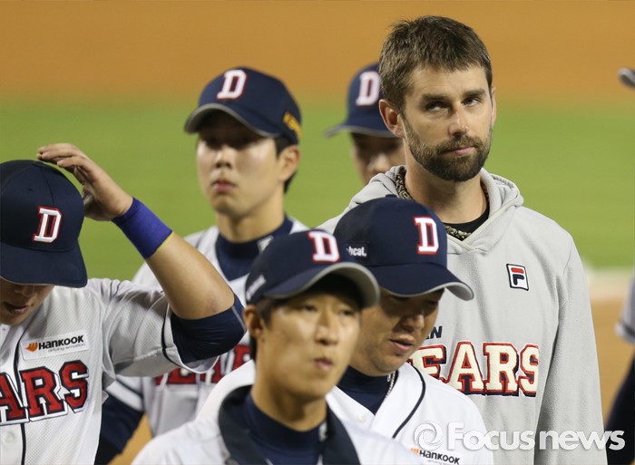 (서울=포커스뉴스) 12일 서울 잠실구장에서 열린 2016 프로야구 kt-두산 경기에서 6회까지 한 명의 주자도 내보내지 않는 퍼펙트 피칭을 한 두산 투수 니퍼트가 경기를 마치고 관중석의 부인을 향해 시선을 보내고 있다.