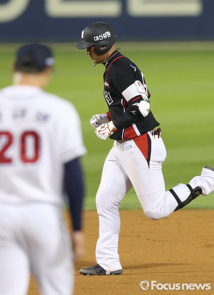 (서울=포커스뉴스) 12일 서울 잠실구장에서 열린 2016 프로야구 kt-두산 경기, 8회초 2사후 kt 김상현이 좌중월 솔로 홈런을 치고 베이스를 돌고 있다.