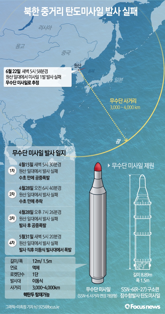 (서울=포커스뉴스) 합동참모본부는 22일 새벽 5시 58분경 북한이 원산 일대에서 무수단미사일로 추정되는 중거리 탄도미사일 1발을 발사했으나 실패한 것으로 추정된다고 밝혔다. 북한은 지난 4월 15일 이후 이번을 포함 총 5차례 무수단미사일 발사를 시도했지만 모두 실패했다.
