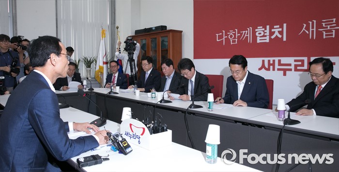 (서울=포커스뉴스) 22일 오전 서울 여의도 국회에서 열린 새누리당 신공항 관련 5개 시도 중진의원 간담회에 참석한 정진석 원내대표 등 의원들이 최정호(오른쪽) 국토교통부 2차관의 현안보고를 받고 있다.