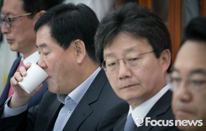 (서울=포커스뉴스) 22일 오전 서울 여의도 국회에서 열린 새누리당 신공항 관련 5개 시도 중진의원 간담회에 참석한 최경환(왼쪽 두번째) 의원이 물을 마시고 있다.