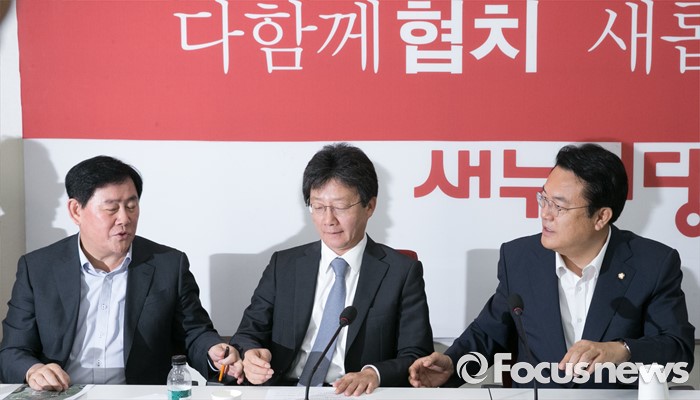 (서울=포커스뉴스) 22일 오전 서울 여의도 국회에서 열린 새누리당 신공항 관련 5개 시도 중진의원 간담회에 참석한 정진석(오른쪽부터) 원내대표, 유승민, 최경환 의원이 서로 발언 순서를 정하고 있다.