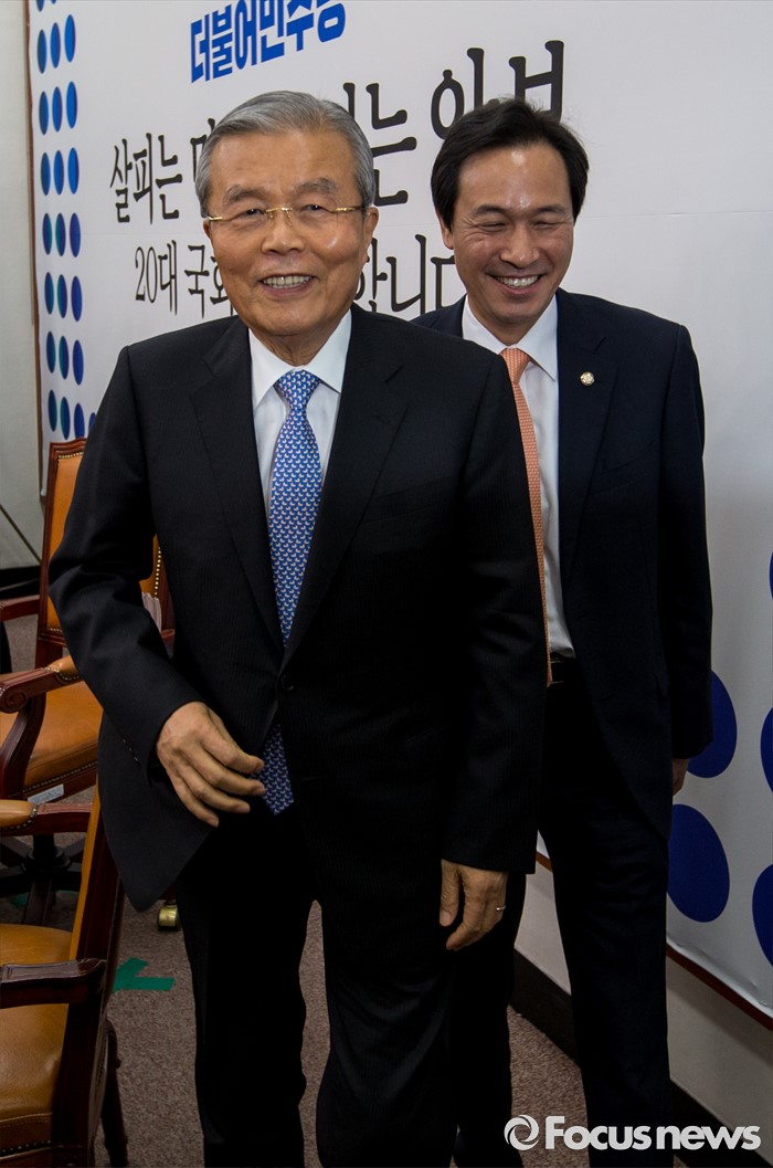 (서울=포커스뉴스) 김종인 더불어민주당 비상대책위 대표와 우상호 원내대표가 22일 오전 서울 여의도 국회에서 열린 비상대책위원회의를 마친 뒤 회의실을 나서고 있다.