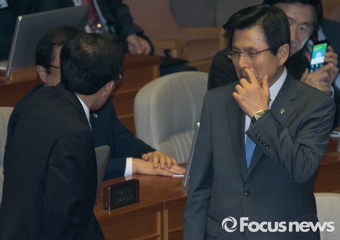 (서울=포커스뉴스) 22일 오전 서울 여의도 국회에서 열린 343회 국회(임시회) 5차 본회의에 참석한 황교안(오른쪽) 국무총리와 추경호 새누리당 의원이 대화하고 있다.