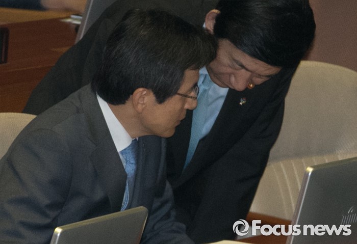 (서울=포커스뉴스) 22일 오전 서울 여의도 국회에서 열린 343회 국회(임시회) 5차 본회의에 참석한 황교안(왼쪽) 국무총리와 윤병세 외교부 장관이 대화하고 있다.