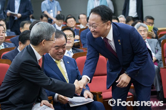 (서울=포커스뉴스) 김희옥(왼쪽) 새누리당 혁신비상대책위원장과 유일호 경제부총리가 22일 오전 서울 여의도 국회 의원회관에서 열린 경제재정연구포럼 토론회에 참석해 인사를 나누고 있다.
