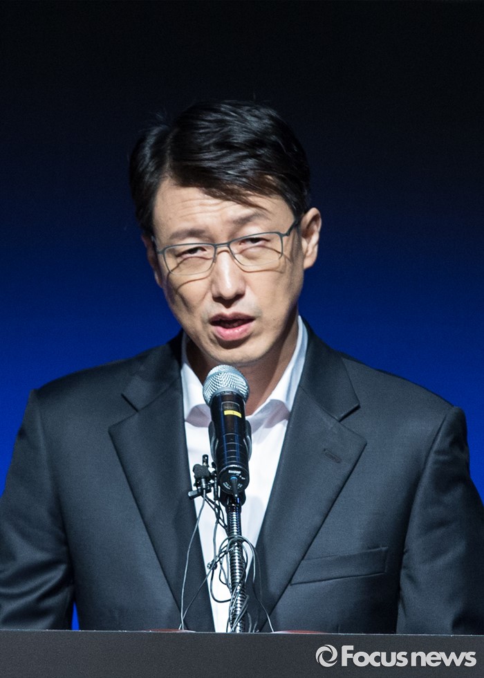 (서울=포커스뉴스) 22일 오전 서울 마포구 팬택 상암사옥에서 열린 'SKY, IM-100' 공개행사에 참석한 문지욱 팬택 사장이 기조 연설을 하고 있다.