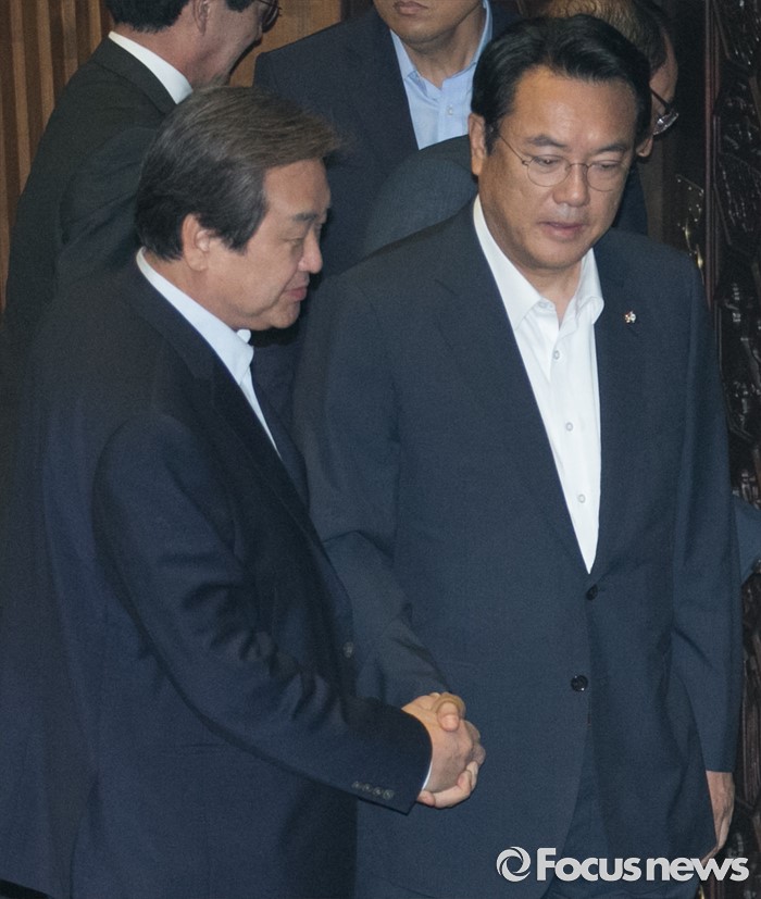 (서울=포커스뉴스) 22일 오전 서울 여의도 국회에서 열린 343회 국회(임시회) 5차 본회의에 참석한 정진석(오른쪽) 새누리당 원내대표와 김무성 전 대표가 악수하고 있다.