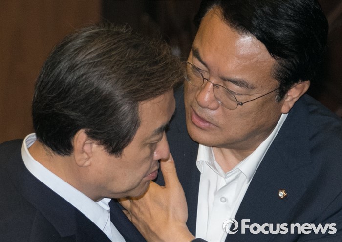 (서울=포커스뉴스) 22일 오전 서울 여의도 국회에서 열린 343회 국회(임시회) 5차 본회의에 참석한 정진석(오른쪽) 새누리당 원내대표와 김무성 전 대표가 대화하고 있다.