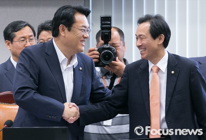(서울=포커스뉴스) 22일 오전 서울 여의도 국회에서 운영위원회 전체회의를 마친 뒤 정진석(왼쪽) 새누리당 원내대표와 우상호 더불어민주당 원내대표가 악수하고 있다.