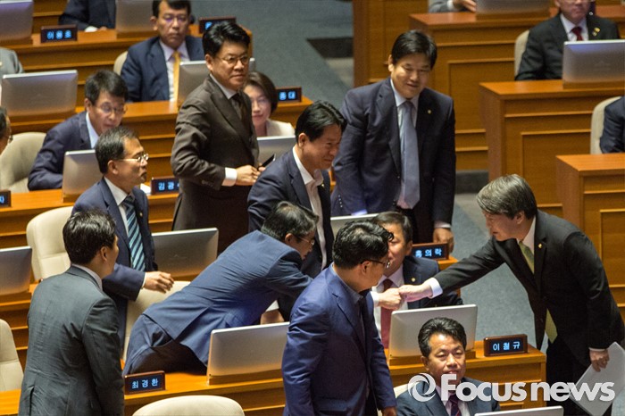 (서울=포커스뉴스) 안철수 국민의당 상임공동대표가 22일 오전 서울 여의도 국회에서 열린 본회의에 참석해 교섭단체대표연설을 마친 뒤 동료 의원들과 악수 하고 있다.